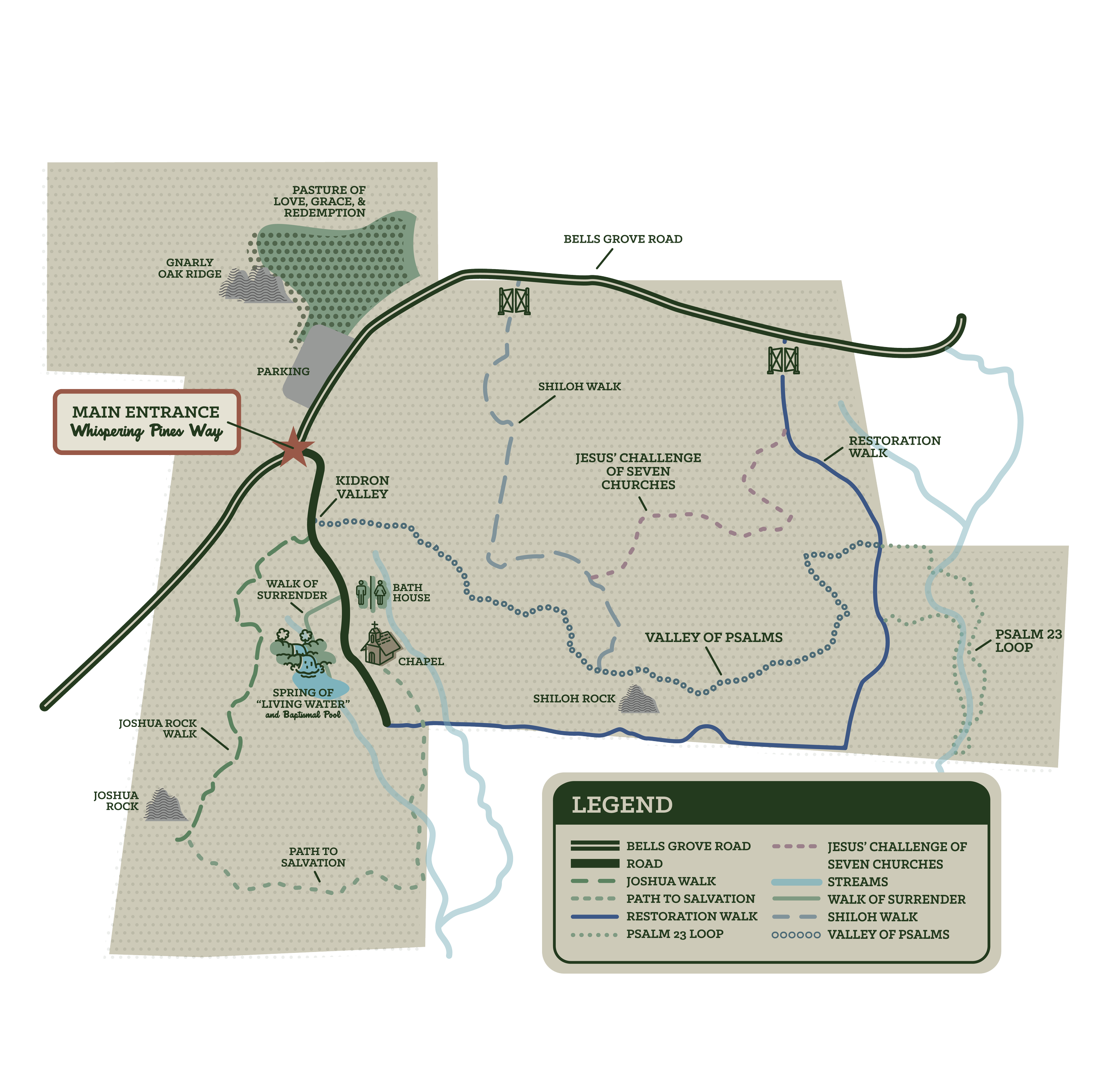 Whispering Pines Sanctuary provides an open air chapel for worship and study, a waterfall-fed baptismal pool, and seven walking trails with five miles or trail to explore. Each path provides guided scripture signs and stations that share God’s story.
